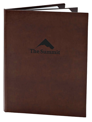 Podemos grabar su logo en estampación oro o plata o bien troquelarlo en seco. La carta puede ir con tornillos vistos o bien tornillos ocultos y si son hasta 8 páginas podríamos colocarle un elástico al medio para no tener que colocar tornillos.