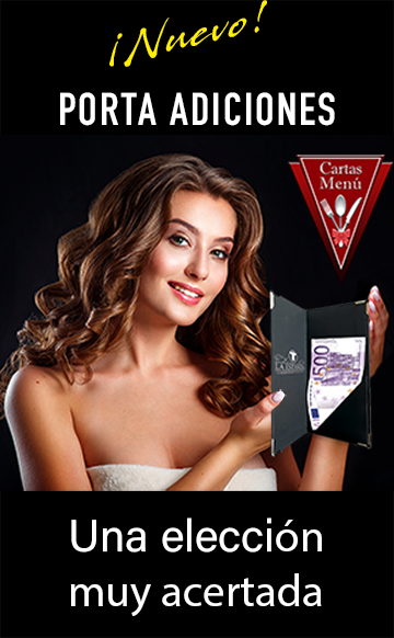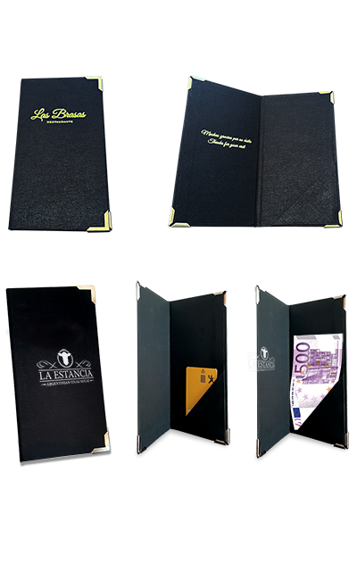 Elegantes porta adiciones para llevar la cuenta a la mesa, con espacio en forma de bolsillo triangular para tarjeta o billetes.